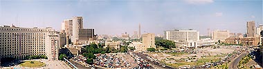 Das Zentrum des modernen Kairo ist der Midan Tahrir. Von hier aus kann man per Bus, Taxi oder U-Bahn die Stadt am besten erkunden. Die wichtigsten Bauten hier sind die Mugamma (Verwaltungsgebäude), gegenüber davon die Amerikanische Universität, das Gebäude der Arabischen Liga und das Nile Hilton Hotel. Das Hotel ist zwar keine architektonische Meisterleistung, aber ein beliebter Treffpunkt von Reisenden aus aller Welt. Im Norden des Platzes befindet sich das berühmte Ägyptische Museum. Eine gute Übernachtungsmöglichkeit ist das Ismailia House Hotel am Tahrir Square. Nicht sehr luxoriös, dafür aber billig und mitten im Zentrum gelegen. Wem Zimmer mit Dusche auf dem Gang nichts ausmachen, der bekommt für etwa 30 Pfund pro Nacht einen gigantischen Ausblick auf einen der belebtesten Plätze Kairos. |